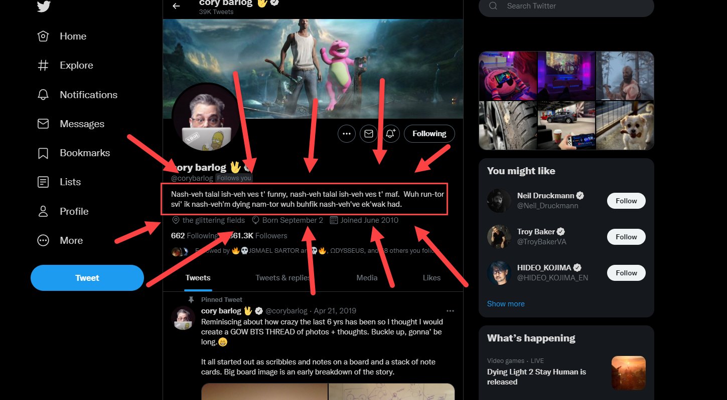من خلال حسابه على تويتر قام بارلوغ بتغير وصف البايو الخاص به الا انه استخدم كلمات واحرف يبدو لنا من الوهلة الاولى انها عشوائية او شيفرة مخفية. يمكنكم زيارة حسابه الخاص عبر الرابط التالي او الاطلاع عليها من خلال الصورة بالاسفل.